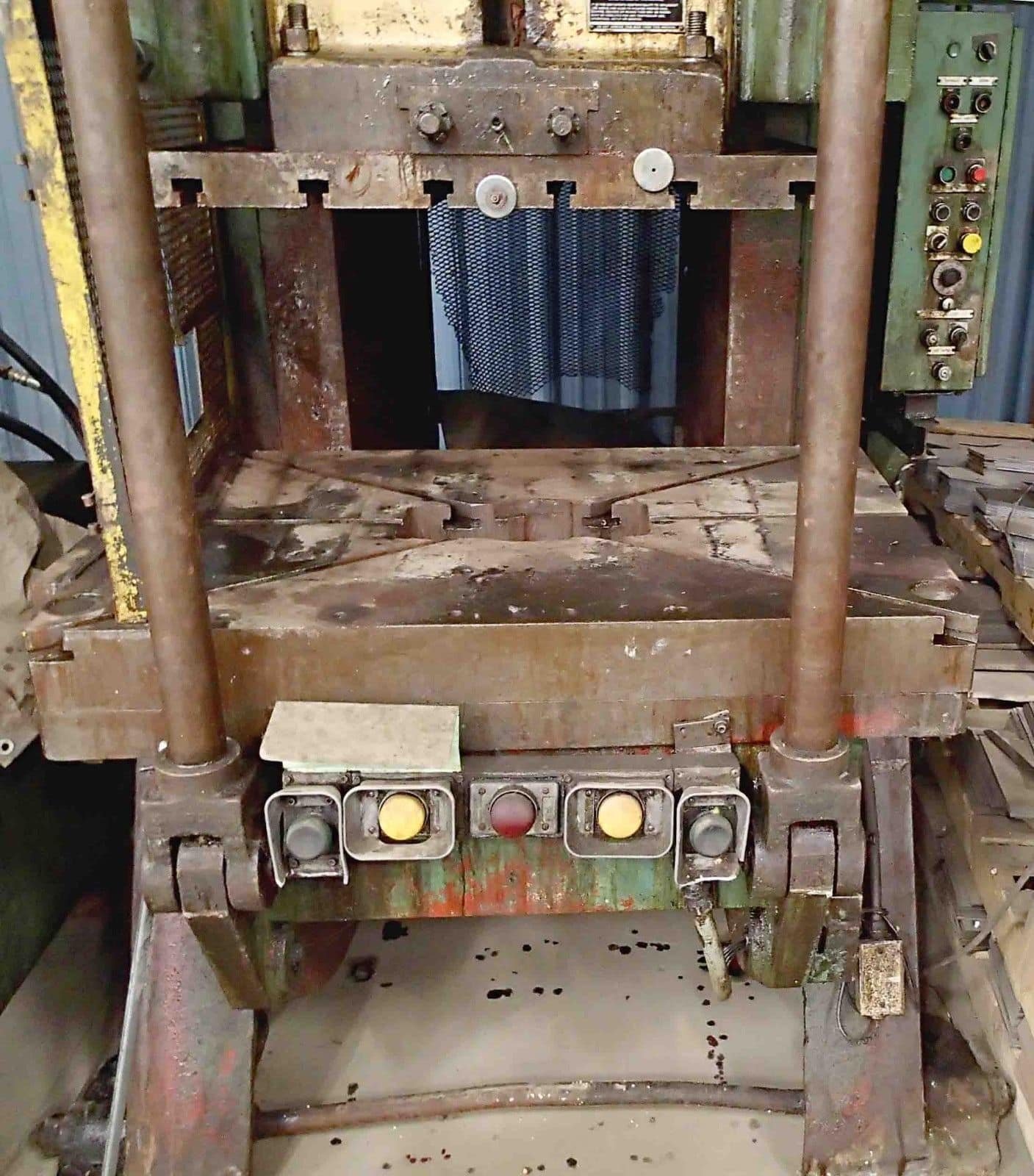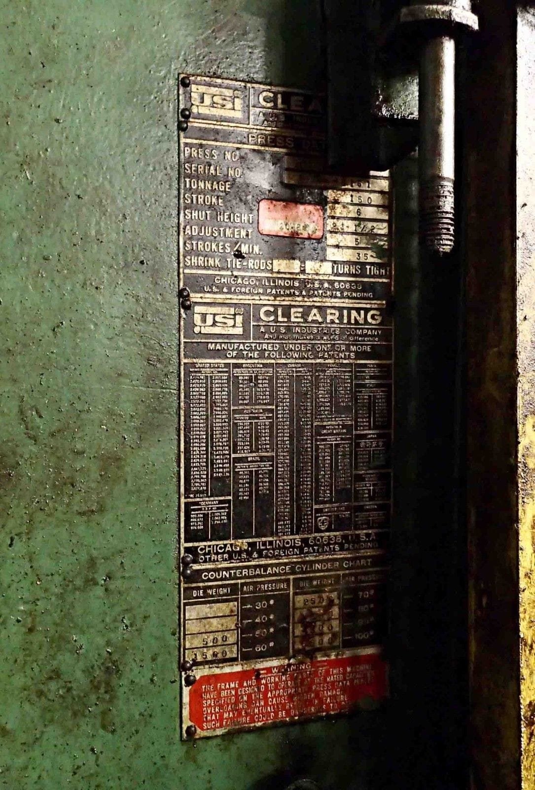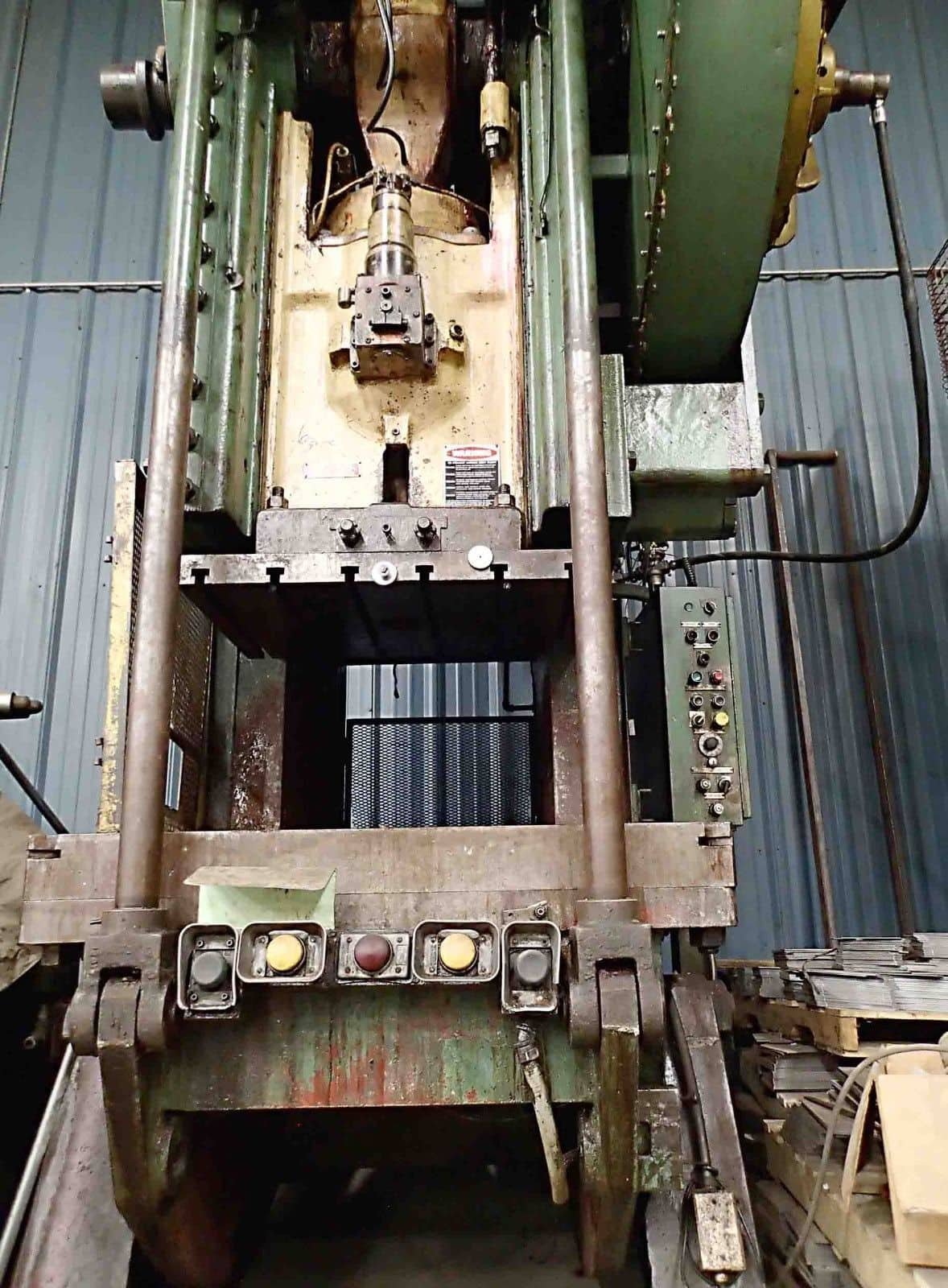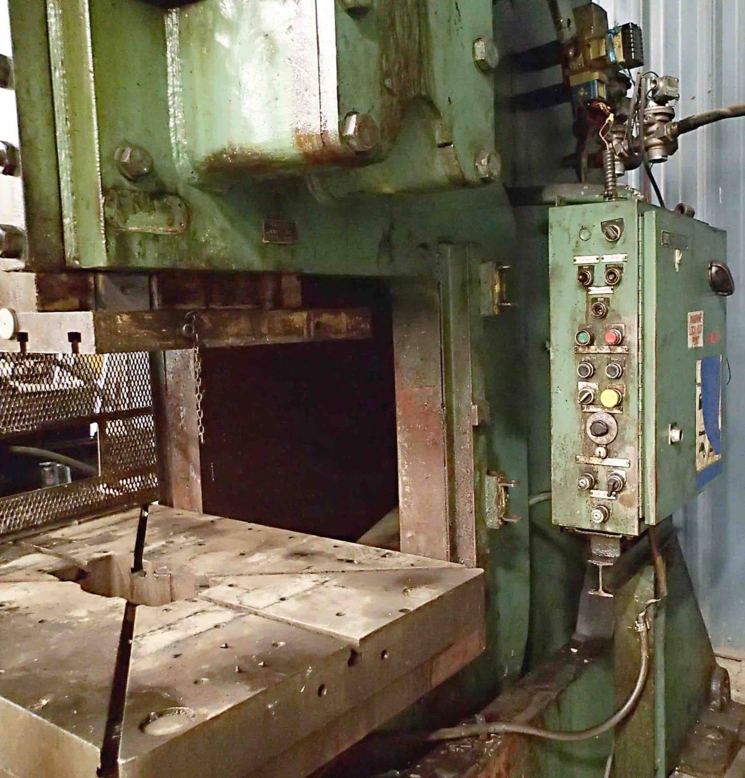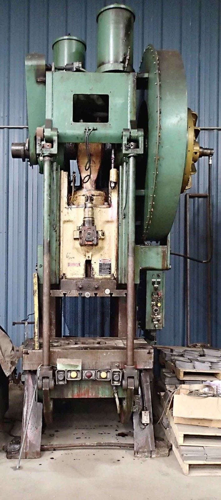 Tonnage: 150 Stroke: 6” Shut Height: 21.5” Adjustment: 5” Strokes Per Minute: 35 Bolster Size: 33” x 50” Equipped With: Air Clutch T-Slotted Ram