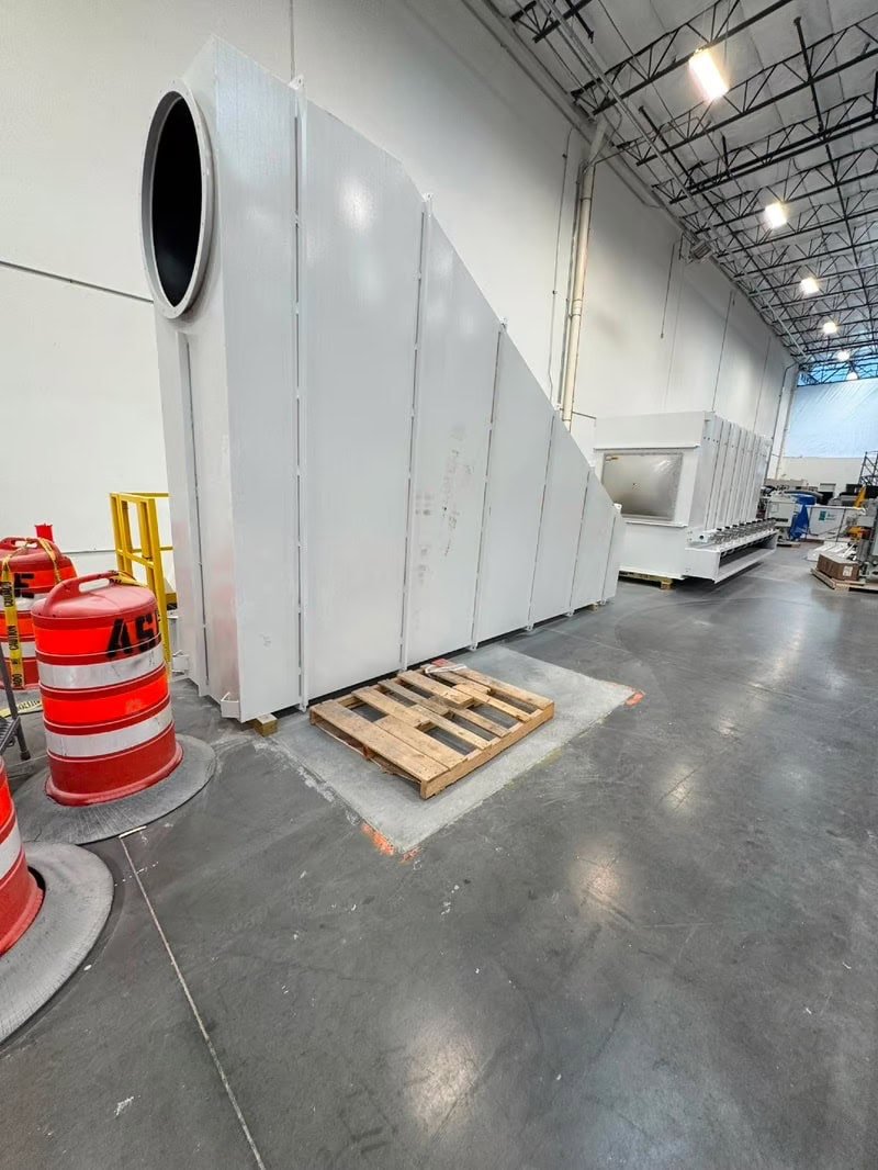 Fan – 125HP Chicago Blower Fan with 20,000 CFM @ 30″ S.P. Exhaust to outside. 4,000 for primary CNC source collection x 2 and 6,000 CFM per enclosure secondary ventilation x2, or 20,000 CFM total.