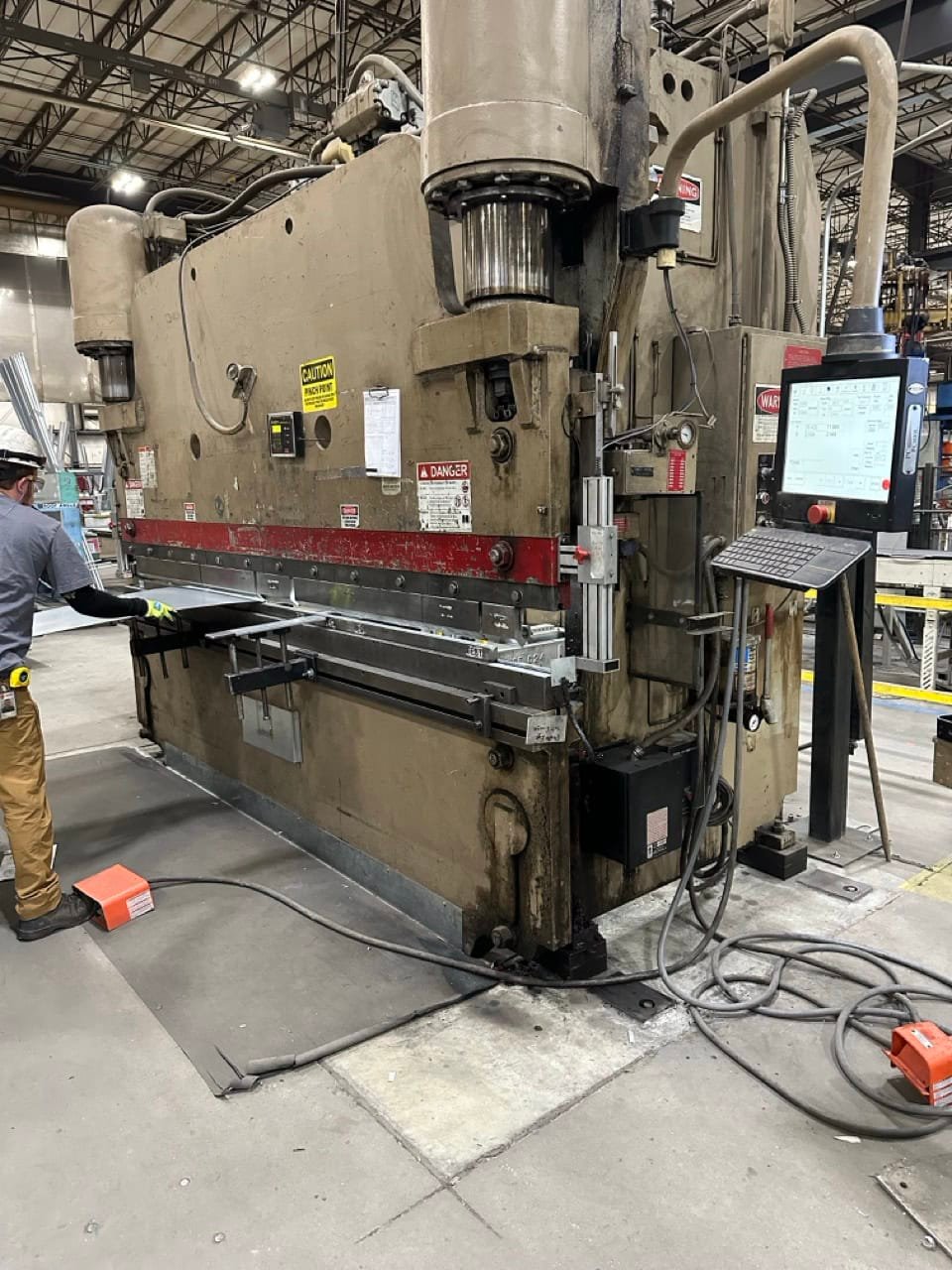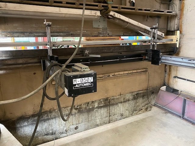 300 ton x 12′ 10’6” between housings 3/8” x 10’ Mild Steel P.L. 11’6” LG Pit Is Required, Drawings available 149” L-R x 96” F-B x 155” Tall AS It Sits on the I beams Approx 41,000 lbs Automec Back Gauge, X Manual R axis