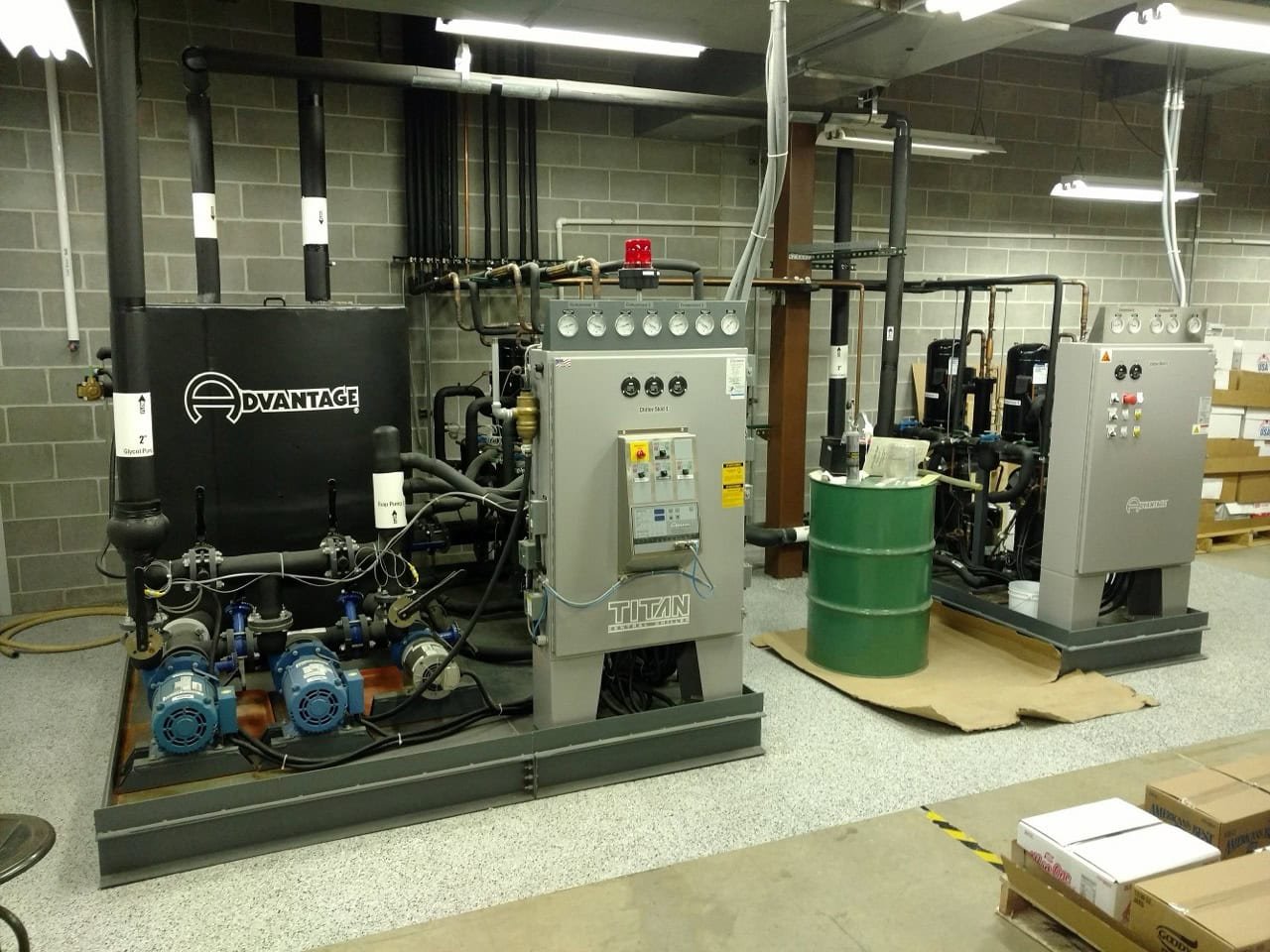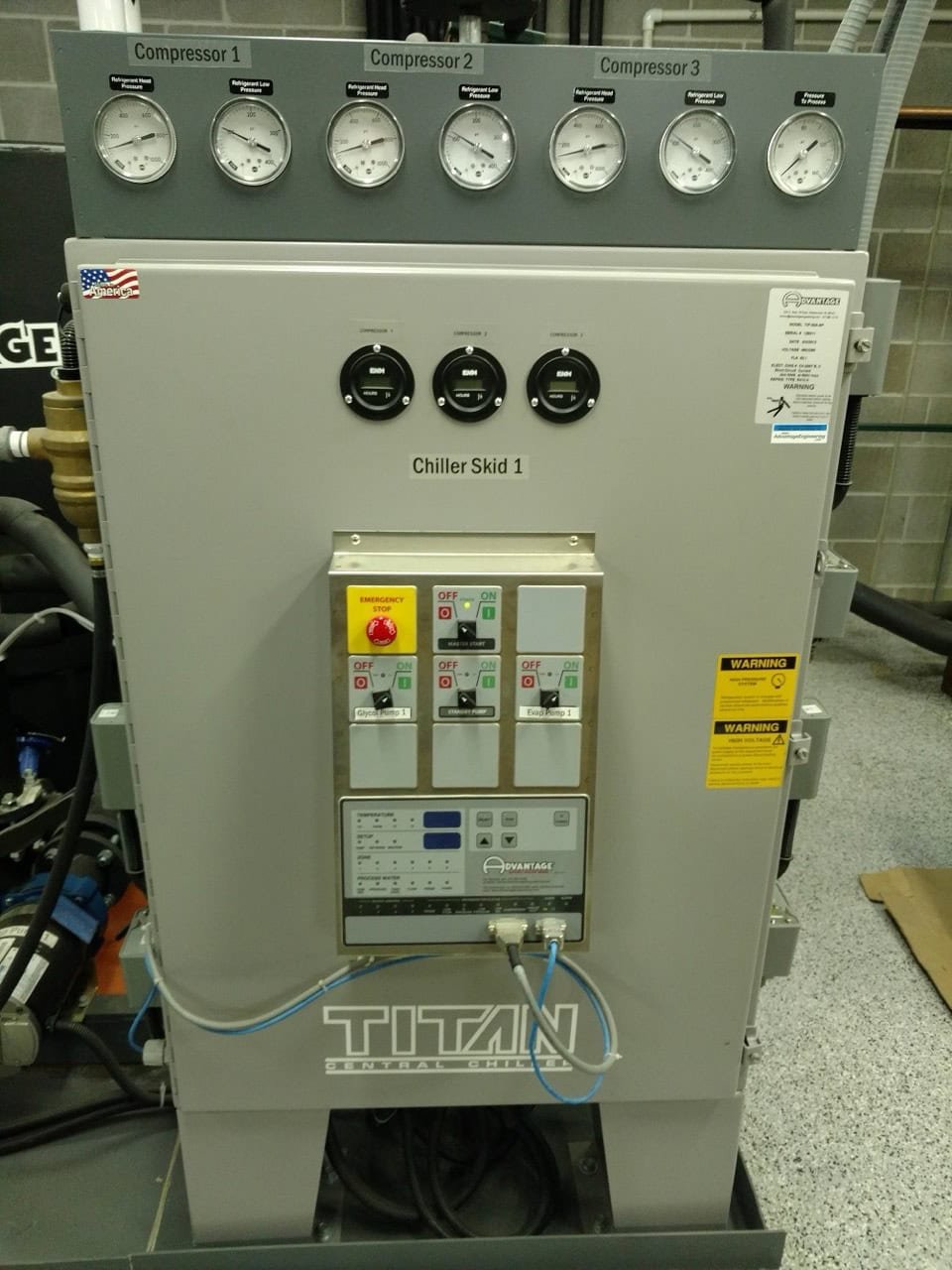 Titan Central Chiller – 50 Ton Split 2 Skids #1 – Model TIP-30A-SP and #2 – Model CC-20APT-RC-2P 460V, 3ph, 60hz – Remote control Remote control with approx. 150’ cable contains stop/start operation, displays temperatures, set point adjustments, zone indication process water indication and alarms. 5 Compressor/evaporators are combined on 2 separate skids 5 roof […]