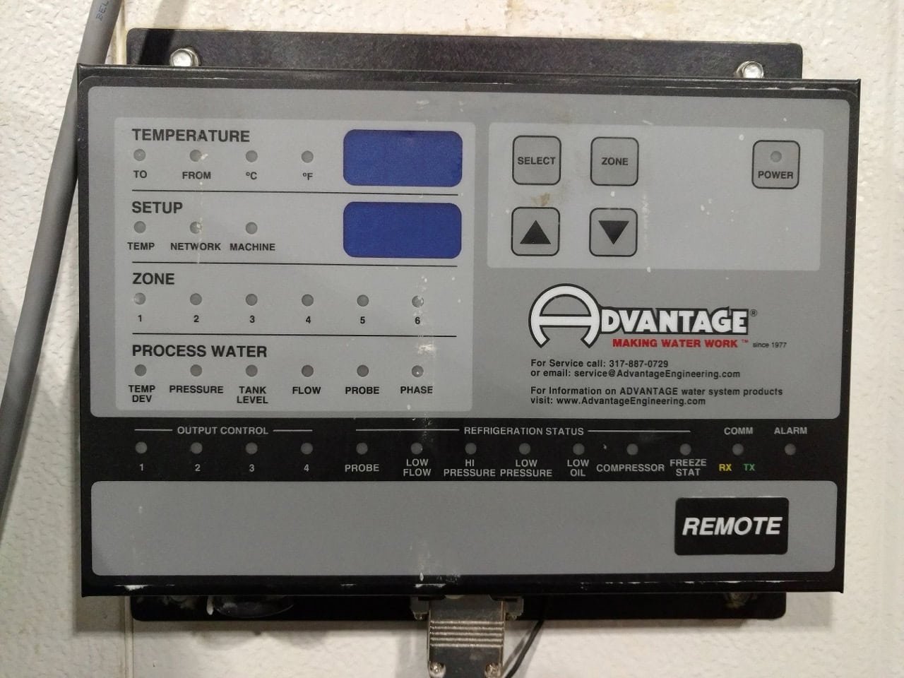 Remote control with approx. 150’ cable contains stop/start operation, displays temperatures, set point adjustments, zone indication process water indication and alarms.
