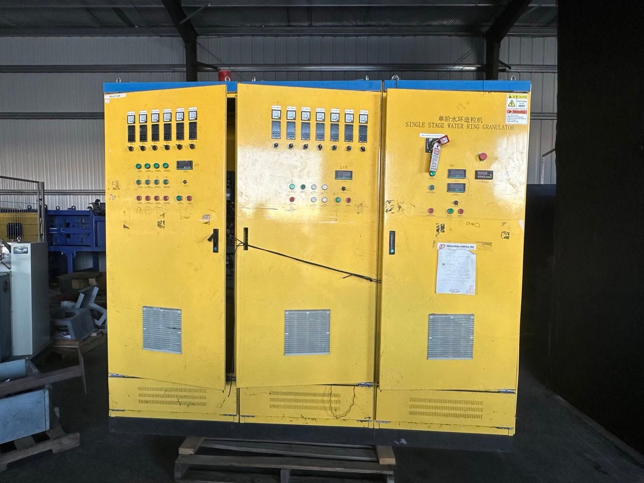 Equipment Overview This is a complete plastic pelletizing system designed for recycling and reprocessing PE/PP and similar thermoplastics. The main unit is a 130mm twin-screw extruder with air-cooled ceramic barrel heating, driven by a 160kW WEG AC motor. Included is a full-sized control cabinet, water-ring cutter assembly, feed conveyor, vertical centrifugal dryer, and shaker screener. […]