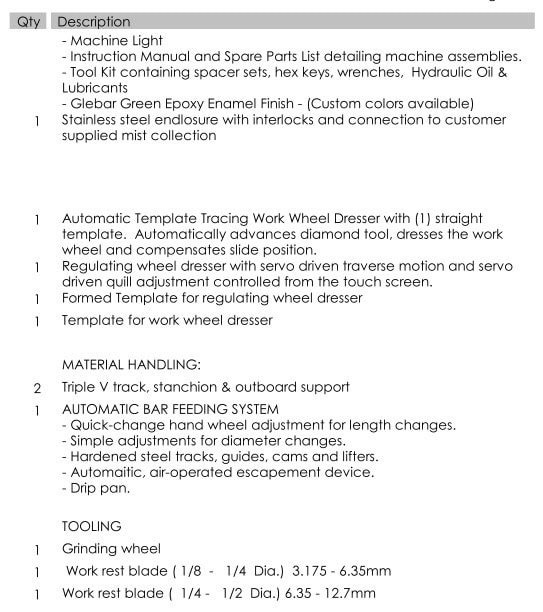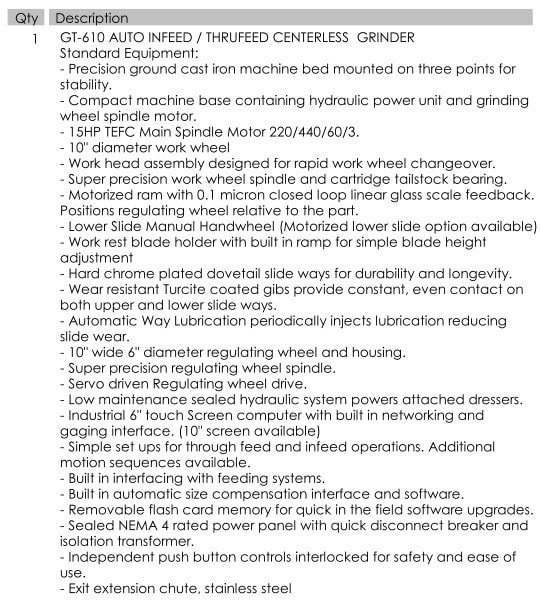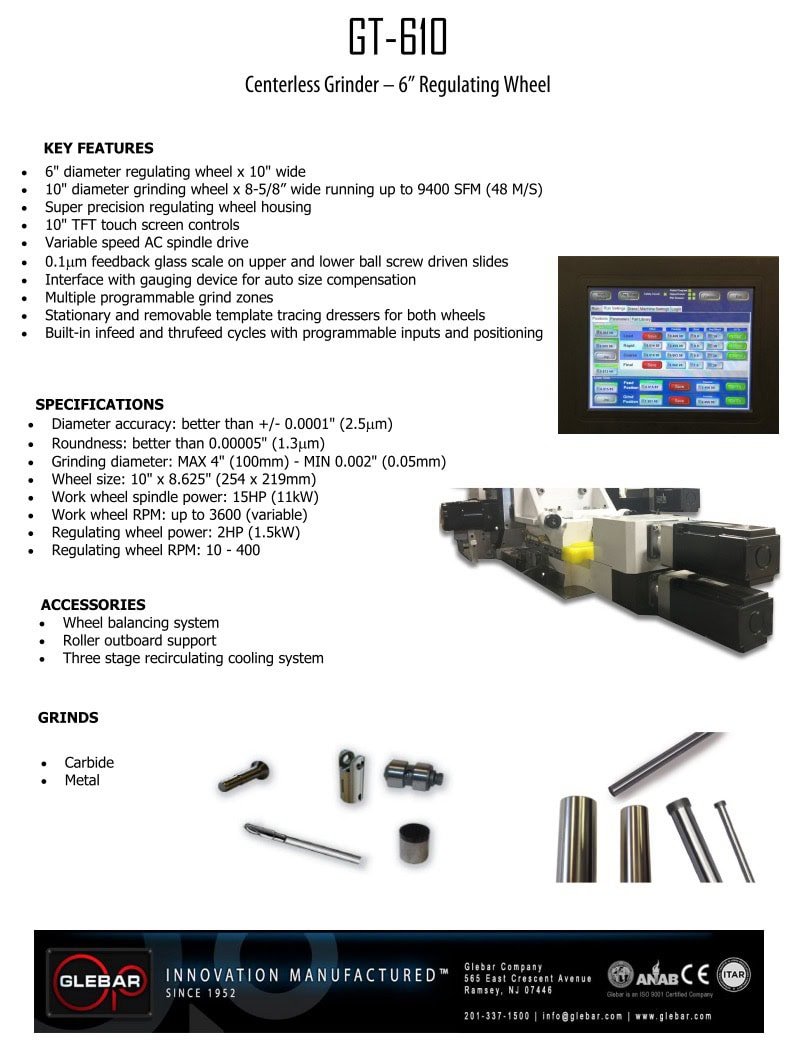 Diameter accuracy: +/- .0001″ Roundness: better than .00005″ Grinding Diameter: Max 4″ Wheel Size: 10″ x 8.625″ Work Wheel Spindle: 15HP Regulating Wheel Power: 2HP Regulating Wheel RPM: 10-400 Equipped with: -Wheel Balancing System -10″ Touch Screen -Glass Scales Upper and Lower Ballscrew -Stainless Steel Enclosure -Wheel Dresser -Tooling Included