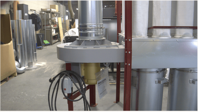 Airflow Capacity: 2000-3000 CFM Pressure Drop: 8.0-5.0 Motor Power: 5 hp Filtration Area: 163 ft3 Filter Bags: 16 Discharge Ports: 2 @ 18″ OAD: 45 x 71 x 107 (inches) Weight: Approx 640lbs