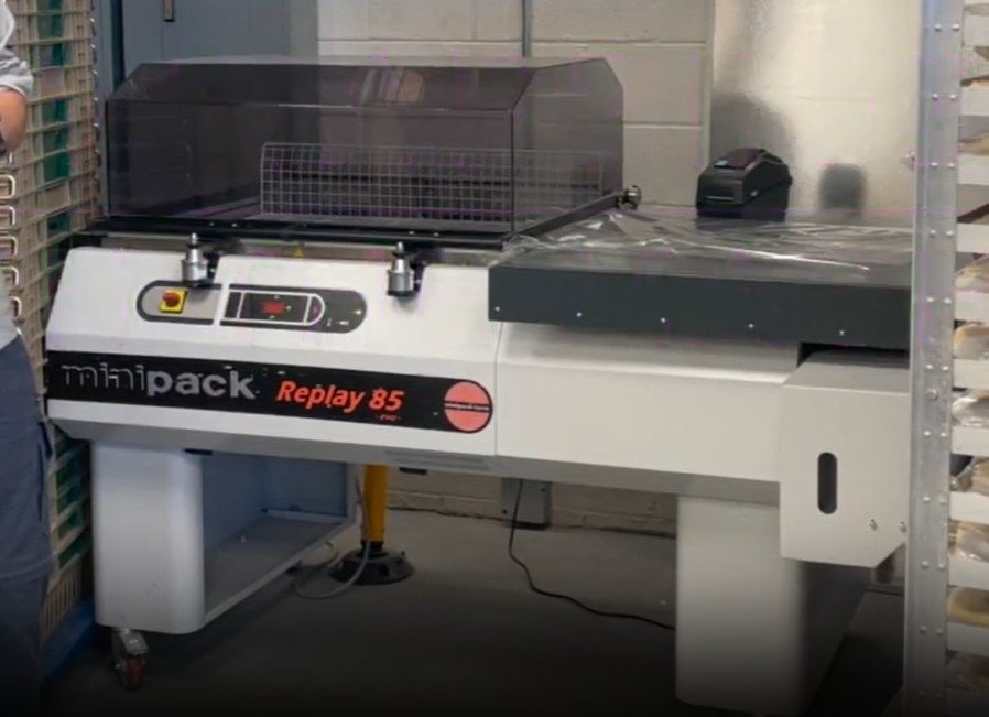 Minipack REPLAY RP85 Semi-Automatic L-Bar Sealer Shrink Wrapper with Shrink Chamber, 2021: Sealing Area: 32″ x 20″ Chamber Height: 8″ Center Folded Film Types: Polyolefin / PVC Maximum Roll Width: 32″ Maximum Roll Diameter: 12″ Machine Width x Length: 78″ x 40″ Machine Height (Lid open/closed) 58″ / 46″
